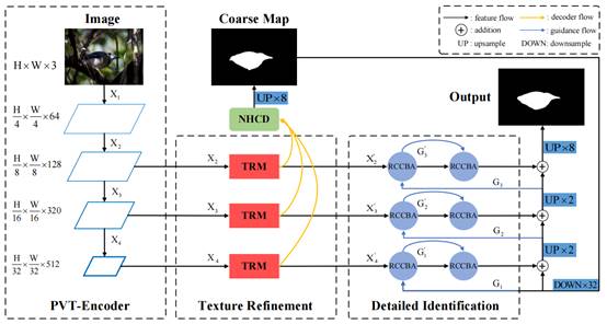 该论文在raybet官网焦铬教授的指导下完成,雷竞技raybet登录入口为唯一署名单位。论文的核心理论是:伪装物体检测作为一种新兴的计算机视觉任务,与传统的物体检测不同的是,伪装物体与其周围环境的纹理是极其相似的,且在大小和形状上也有很大的不同,这使得伪装物体的检测变得极具挑战性。因此,本论文提出了一种增强识别网络,用以增强伪装物体的检测能力。EINet主要由三个部分组成,首先,论文使用了PVT作为编码器,目的是在能够更好地学习到伪装物体检测任务的高分辨率表达前提下,提取出更加强健和更具鲁棒性的特征;然后,为了使得网络的学习能够朝着正确识别伪装物体的方向前进,论文提出了TRM模块用以获取细粒度特征,并且提出了NHCD解码器用以生成精确识别伪装物体的引导先验;最后,在引导先验的指导下,论文还设计了一个全新的RCCBA模块用以识别多尺度的细粒度特征,从而对伪装物体的识别能力进行增强。论文还经过大量地消融实验证明,EINet对于伪装物体的识别能力远远领先于现有的伪装物体检测模型,达到了目前的SOTA性能。